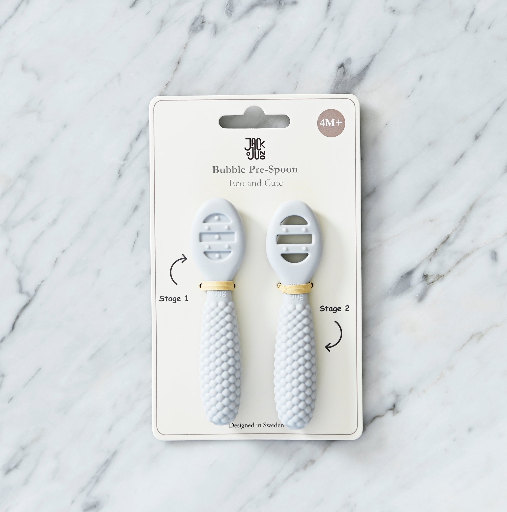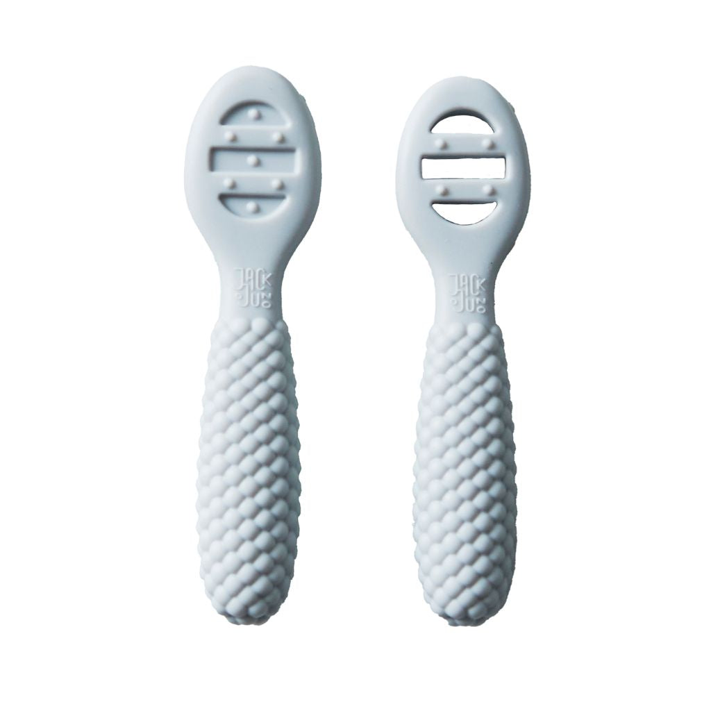Dette Pre-Spoon-settet fra Jack o Juno er utviklet spesielt for babyer som skal lære å spise selv. Settet består av to silikonbabyskjeer med et unikt 2-trinns design som støtter barnets utvikling – steg for steg.
