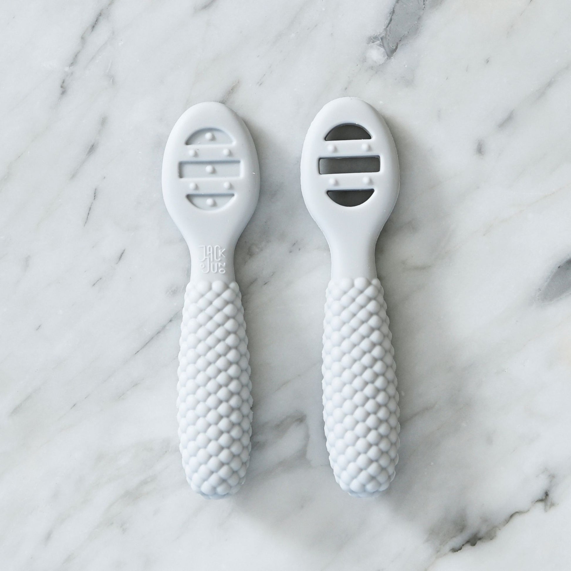Begge skjeene har myke sensorkuler og riller som lindrer kløende tannkjøtt, samtidig som de fungerer som en stopper for å hindre at skjeen føres for langt inn i munnen.