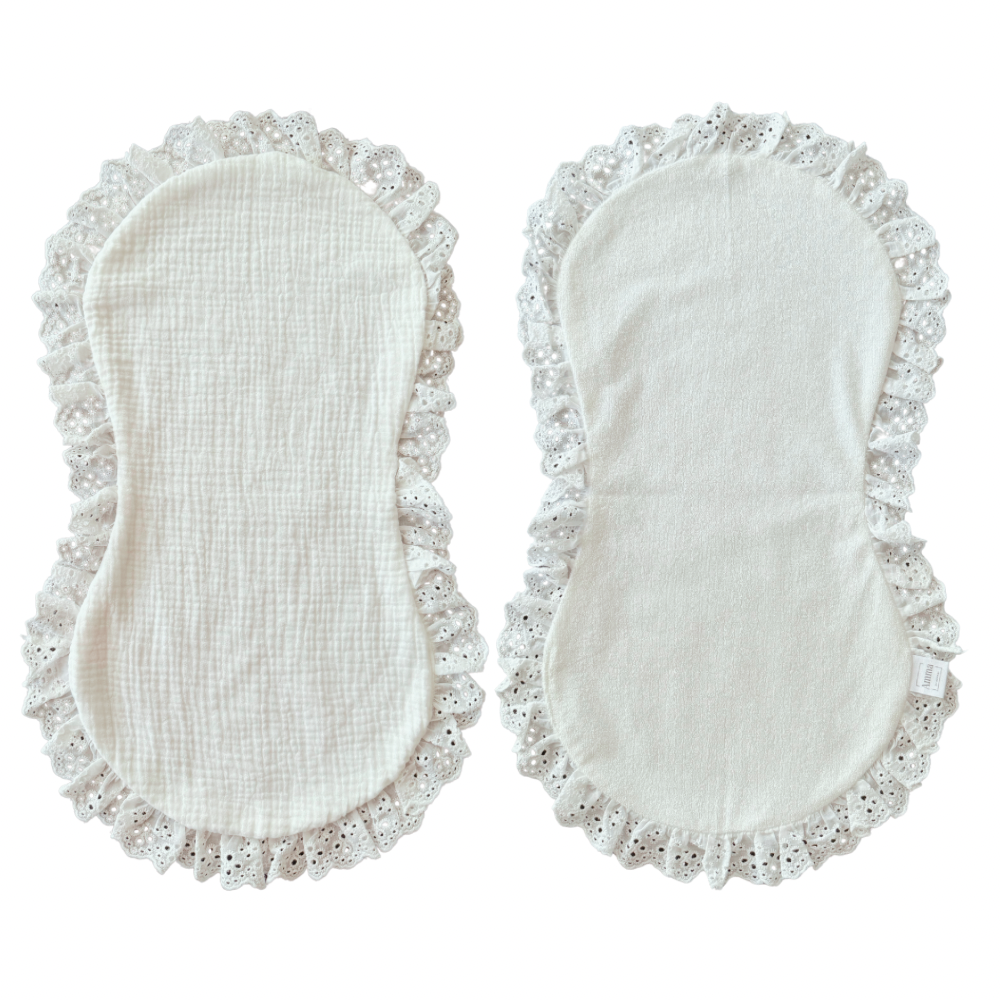 Materialer: Oversiden er laget av myk musselin i 100% Oeko-Tex-sertifisert bomull – et trygt valg, testet og fri for skadelige stoffer. Undersiden er av absorberende bomullsfrotté kombinert med et tynt lag PUL, det samme pustende og vanntette materialet som brukes i blant annet tøybleier, ammeinnlegg og stellematter.