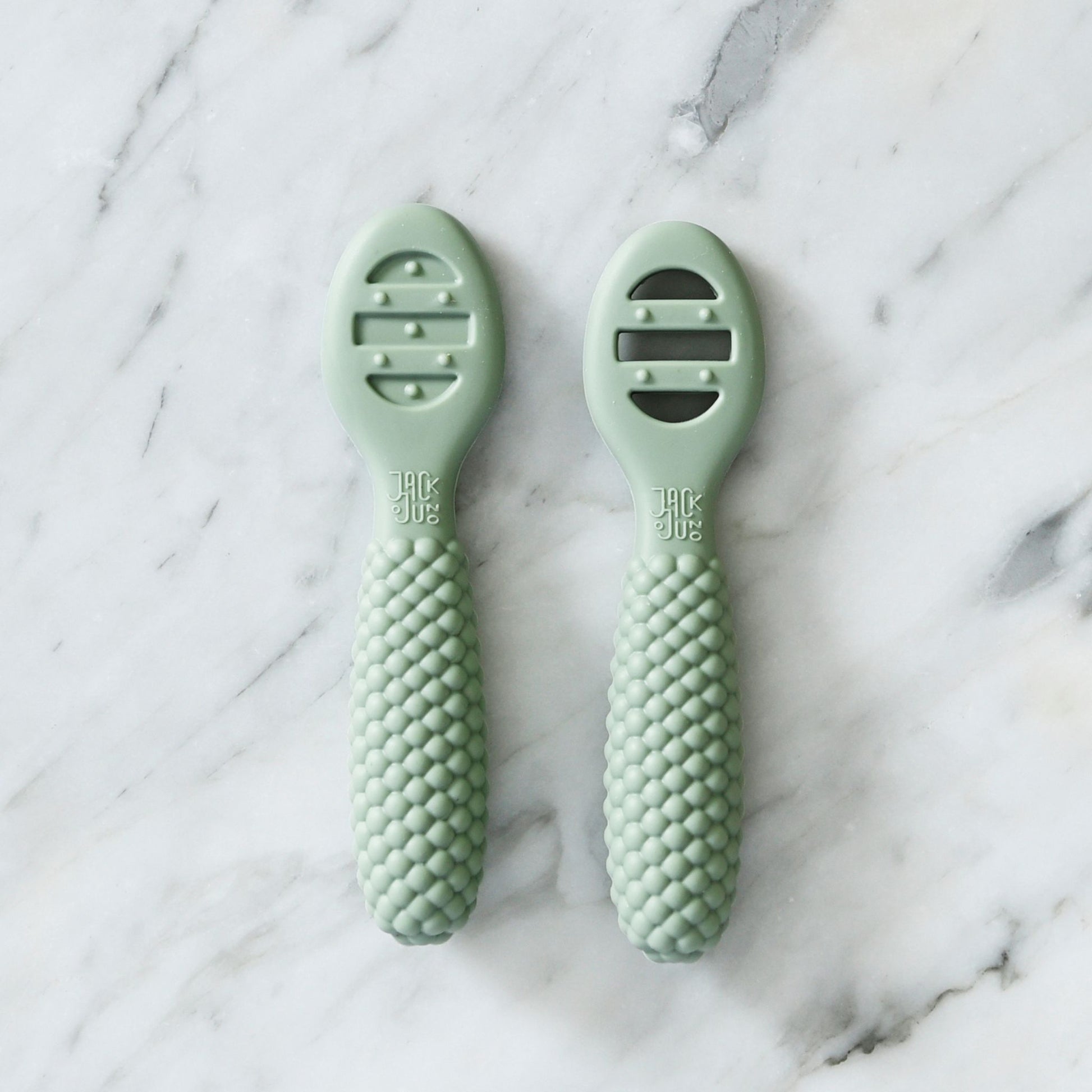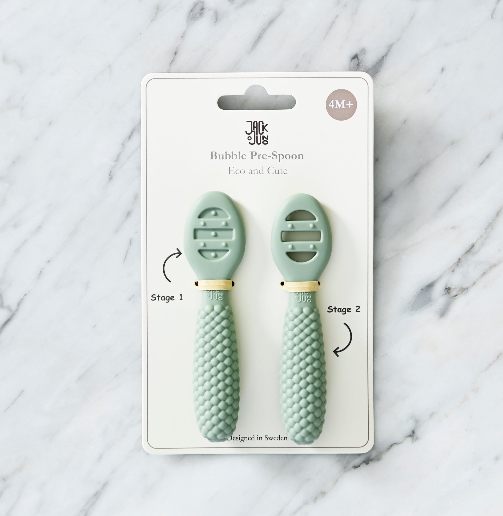 Dette Pre-Spoon-settet fra Jack o Juno er utviklet spesielt for babyer som skal lære å spise selv. Settet består av to silikonbabyskjeer med et unikt 2-trinns design som støtter barnets utvikling – steg for steg.