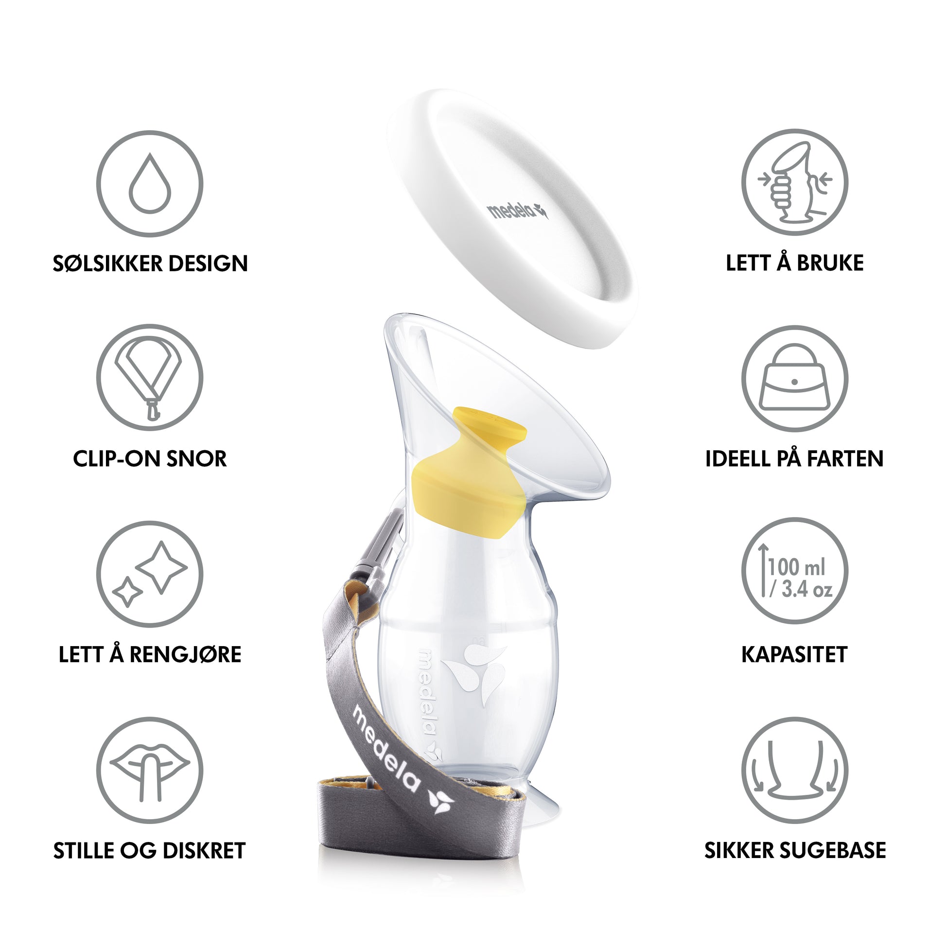 NB: Denne brystmelkoppsamleren er ikke designet for aktiv pumping, men fungerer utmerket sammen med en manuell eller elektrisk brystpumpe for å maksimere melkeutbyttet.